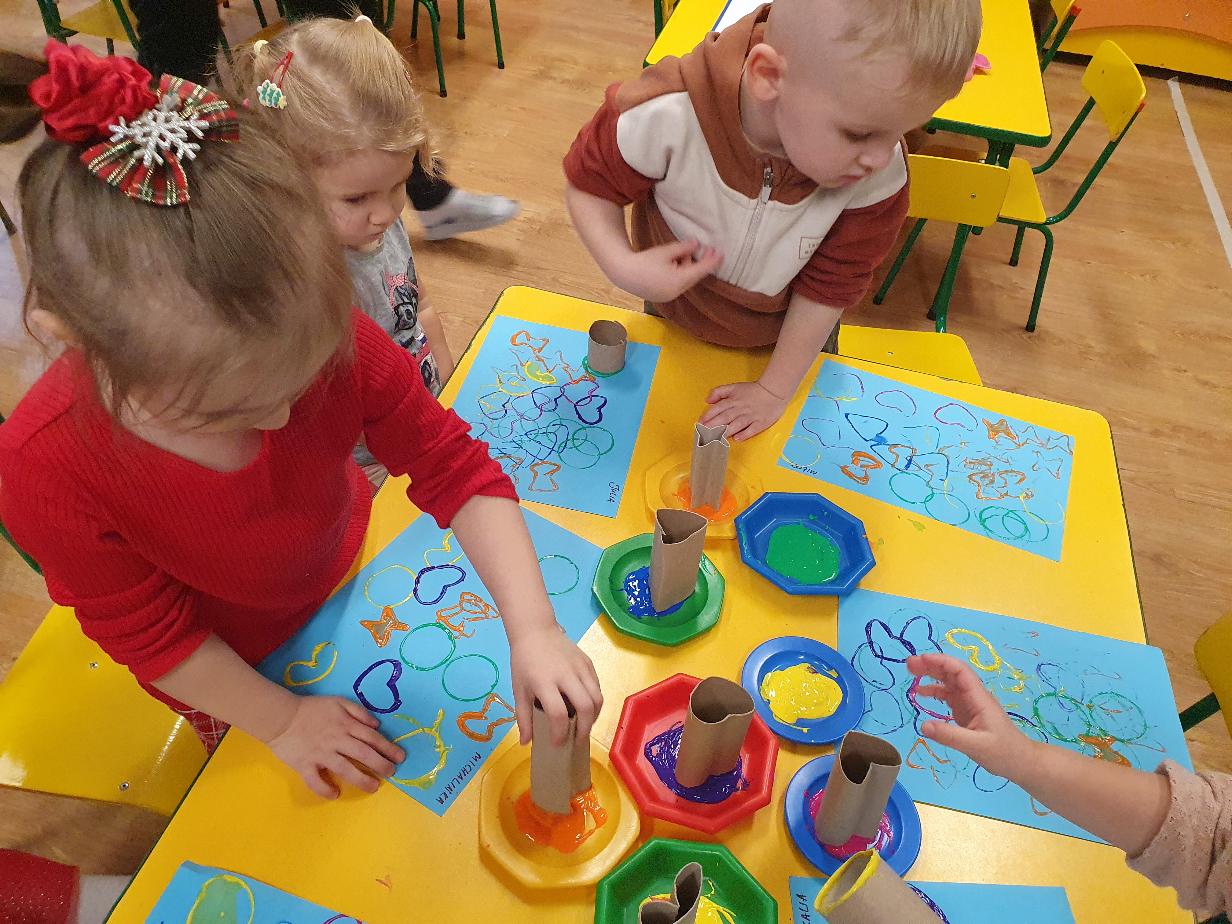 Dzieci z grupy maluszków w ramach zajęć „Aktywny Maluszek” odkrywały świat sztuki poprzez zabawę pieczątkami.