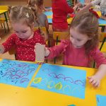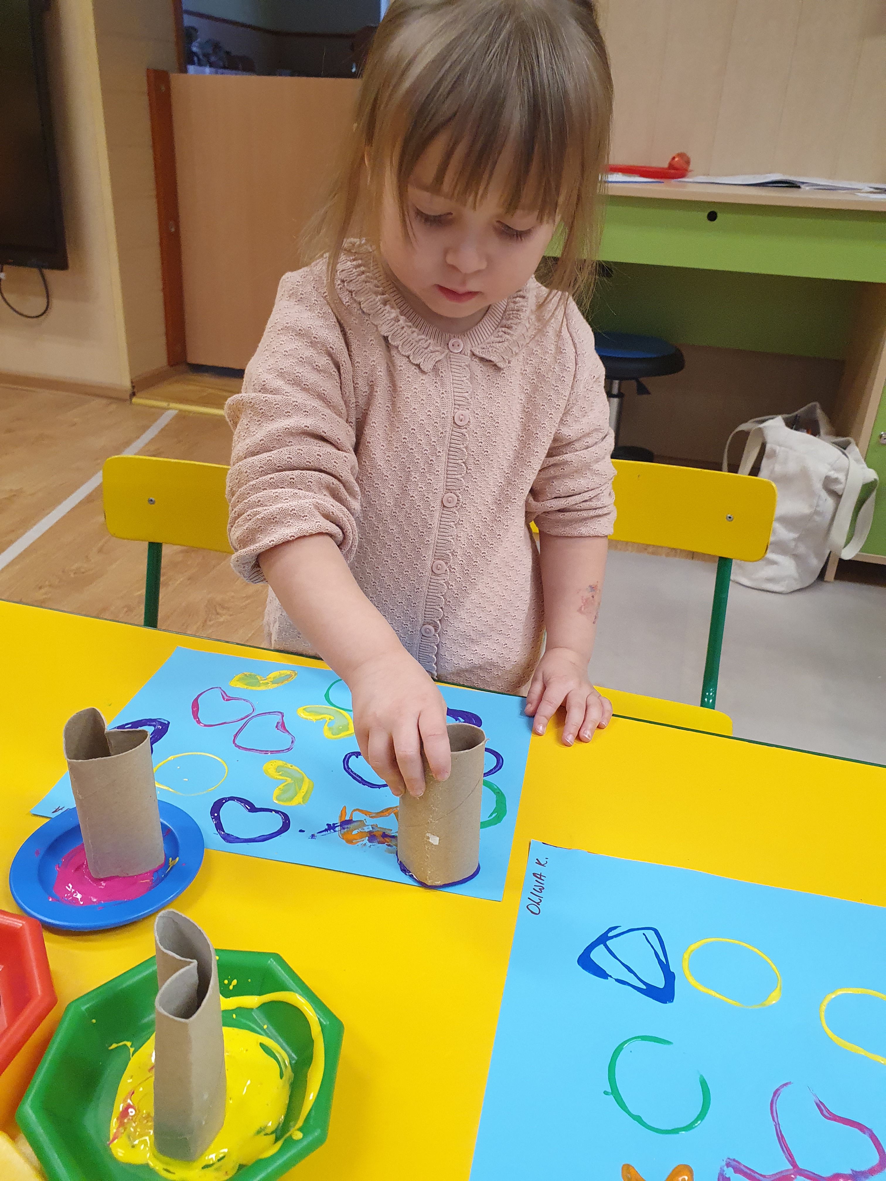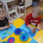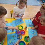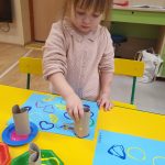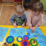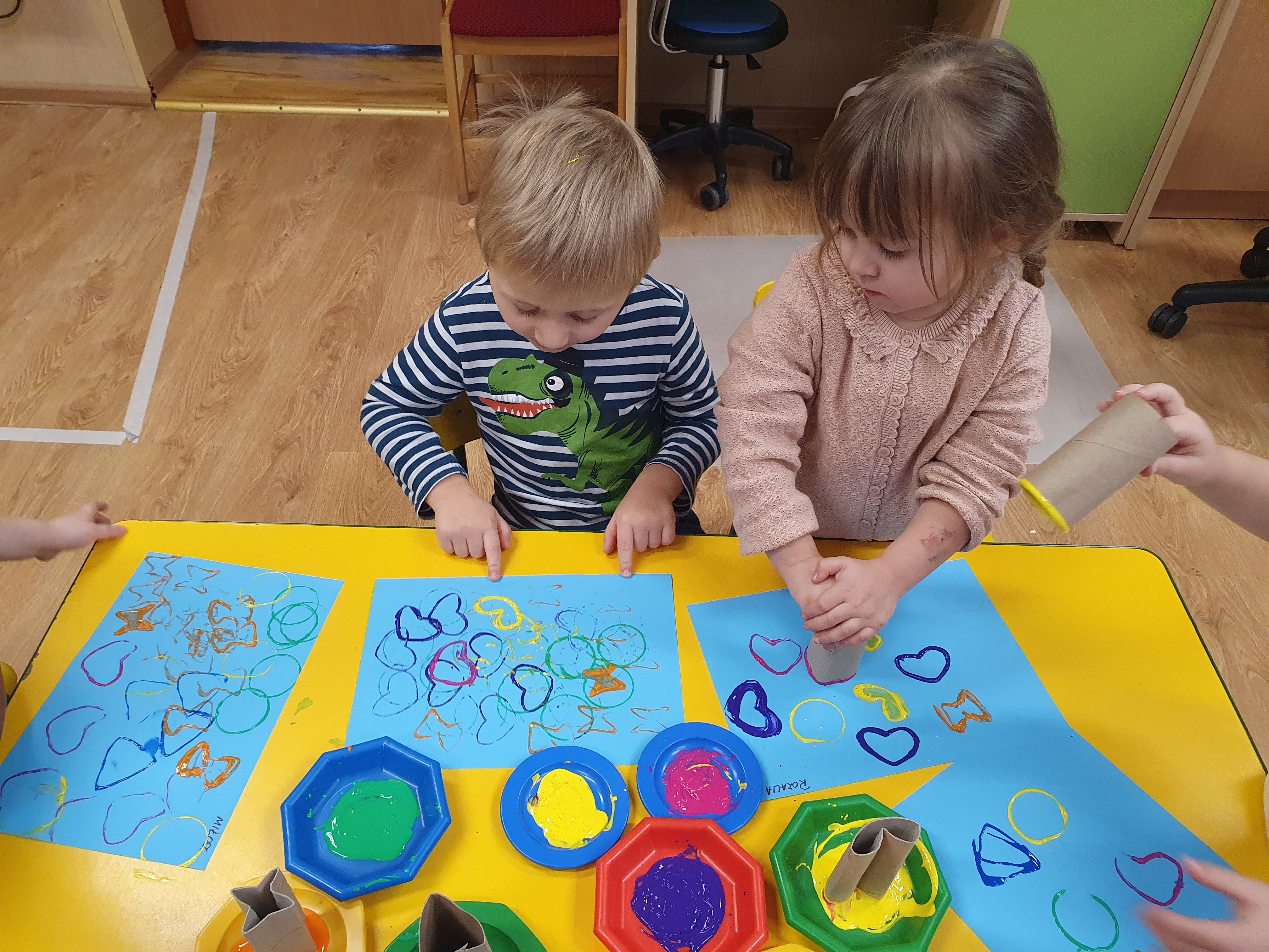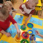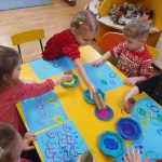 Dzieci z grupy maluszków w ramach zajęć „Aktywny Maluszek” odkrywały świat sztuki poprzez zabawę pieczątkami.