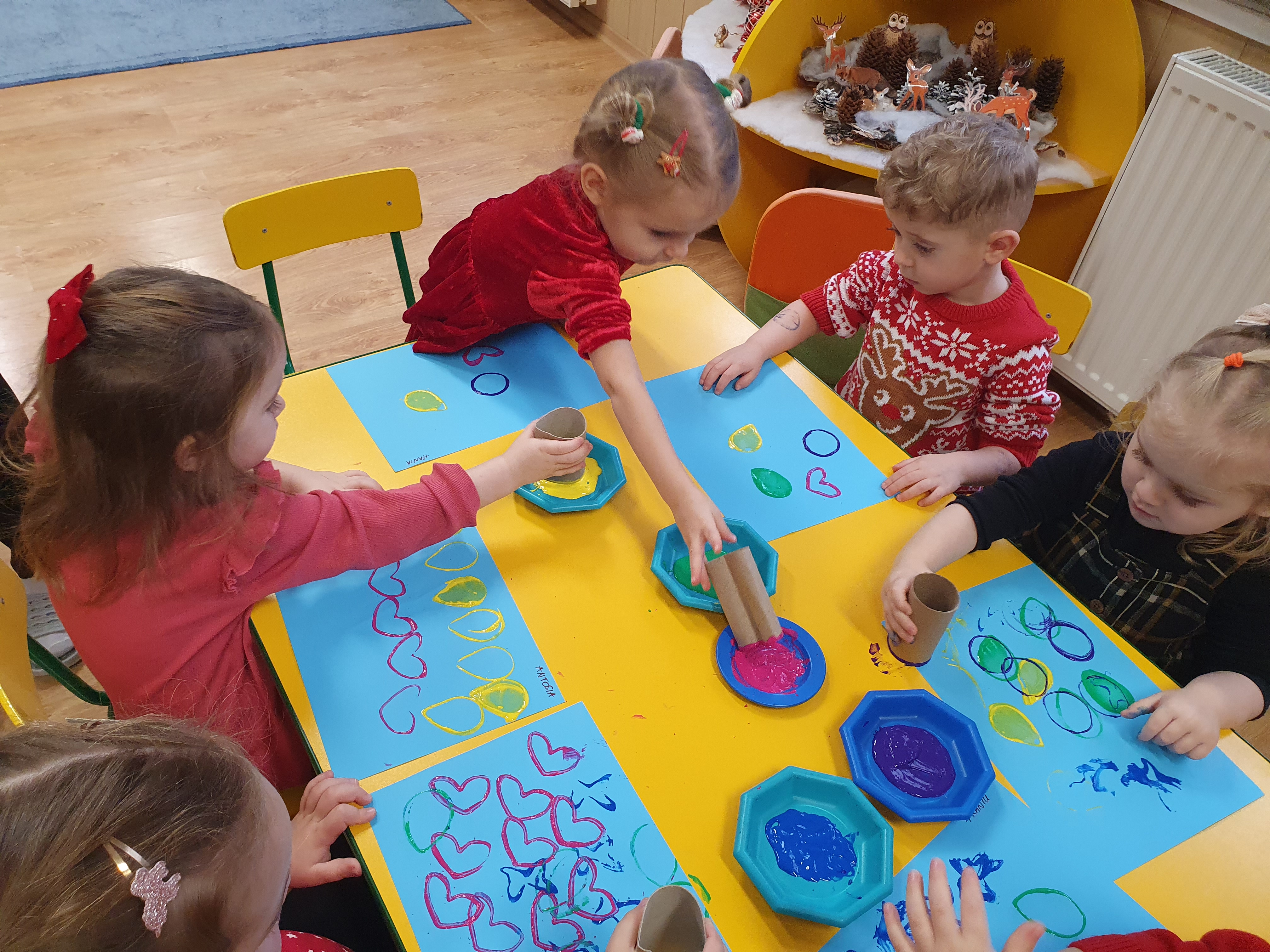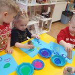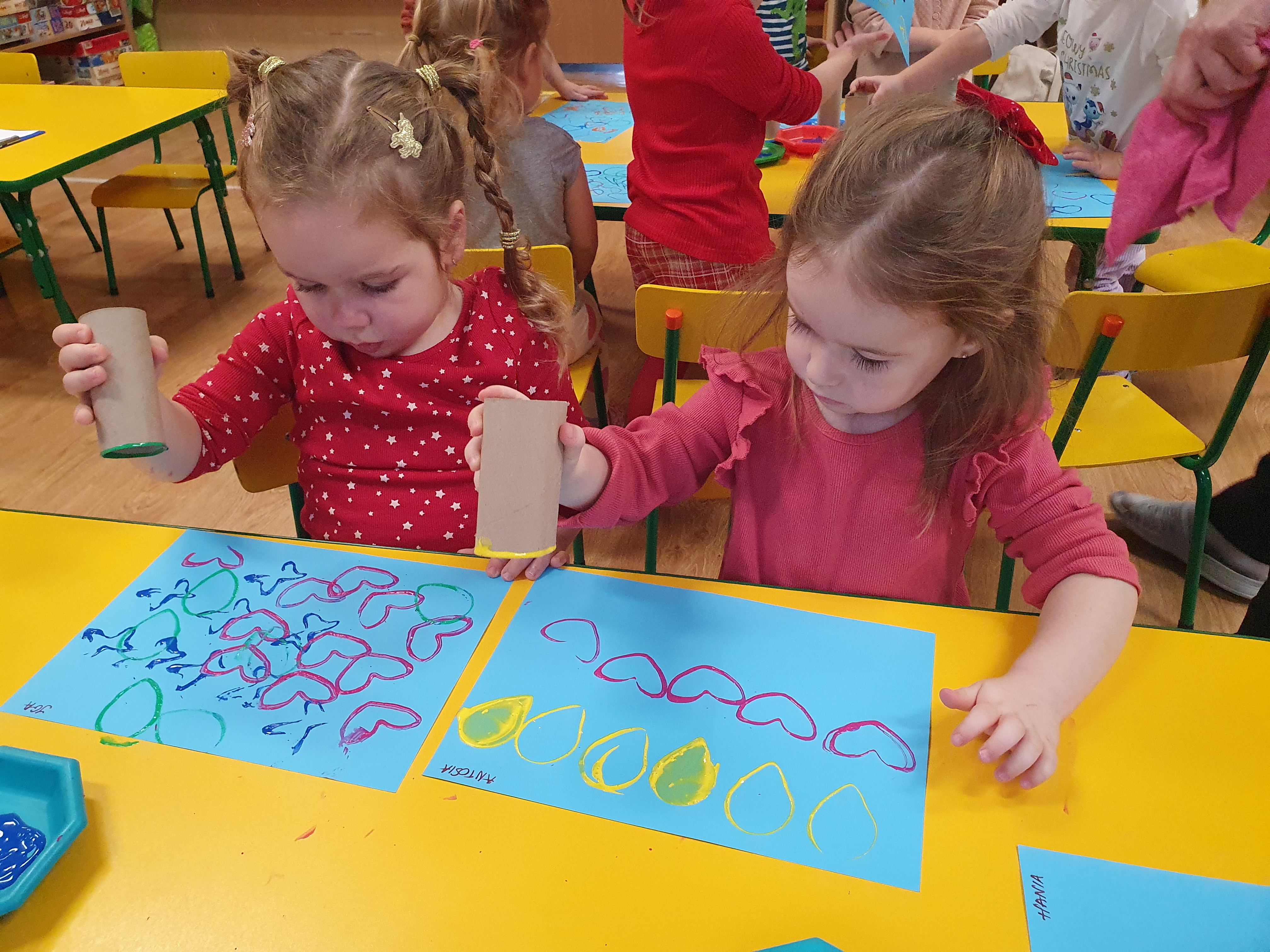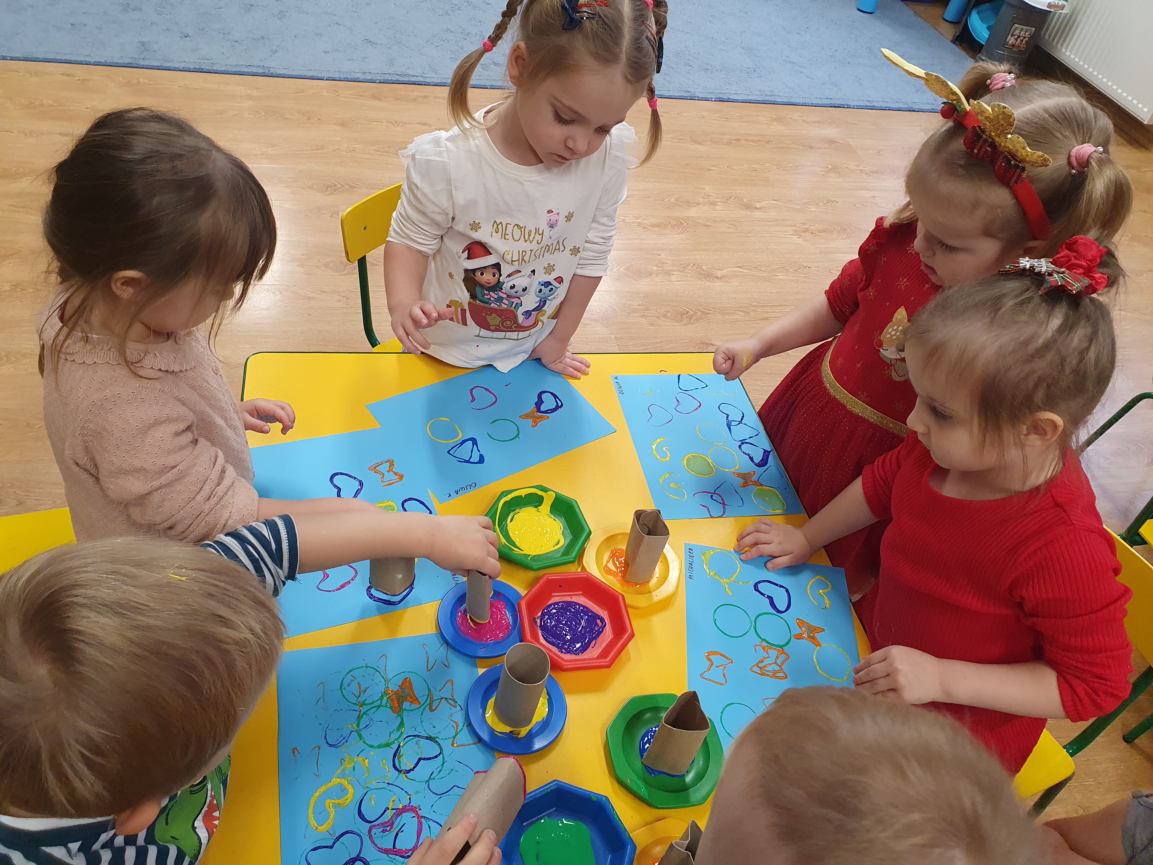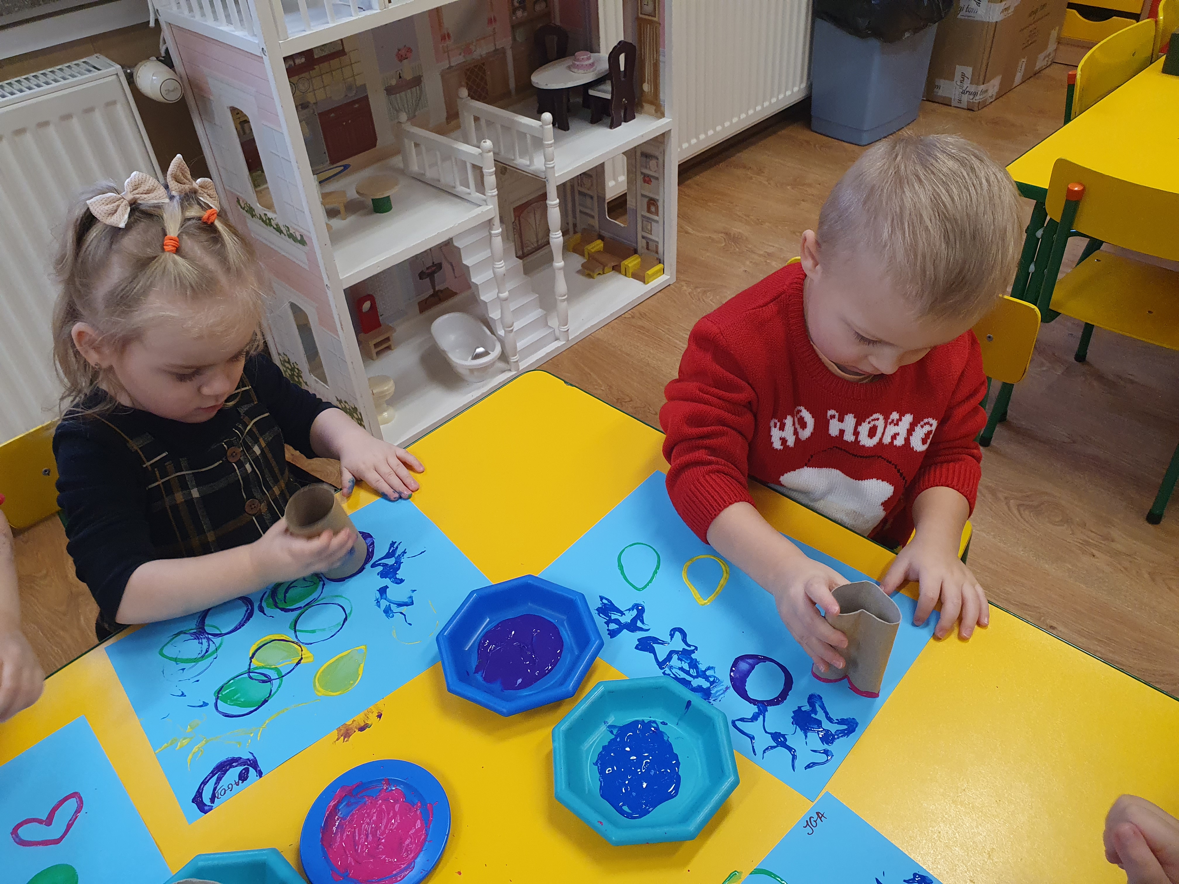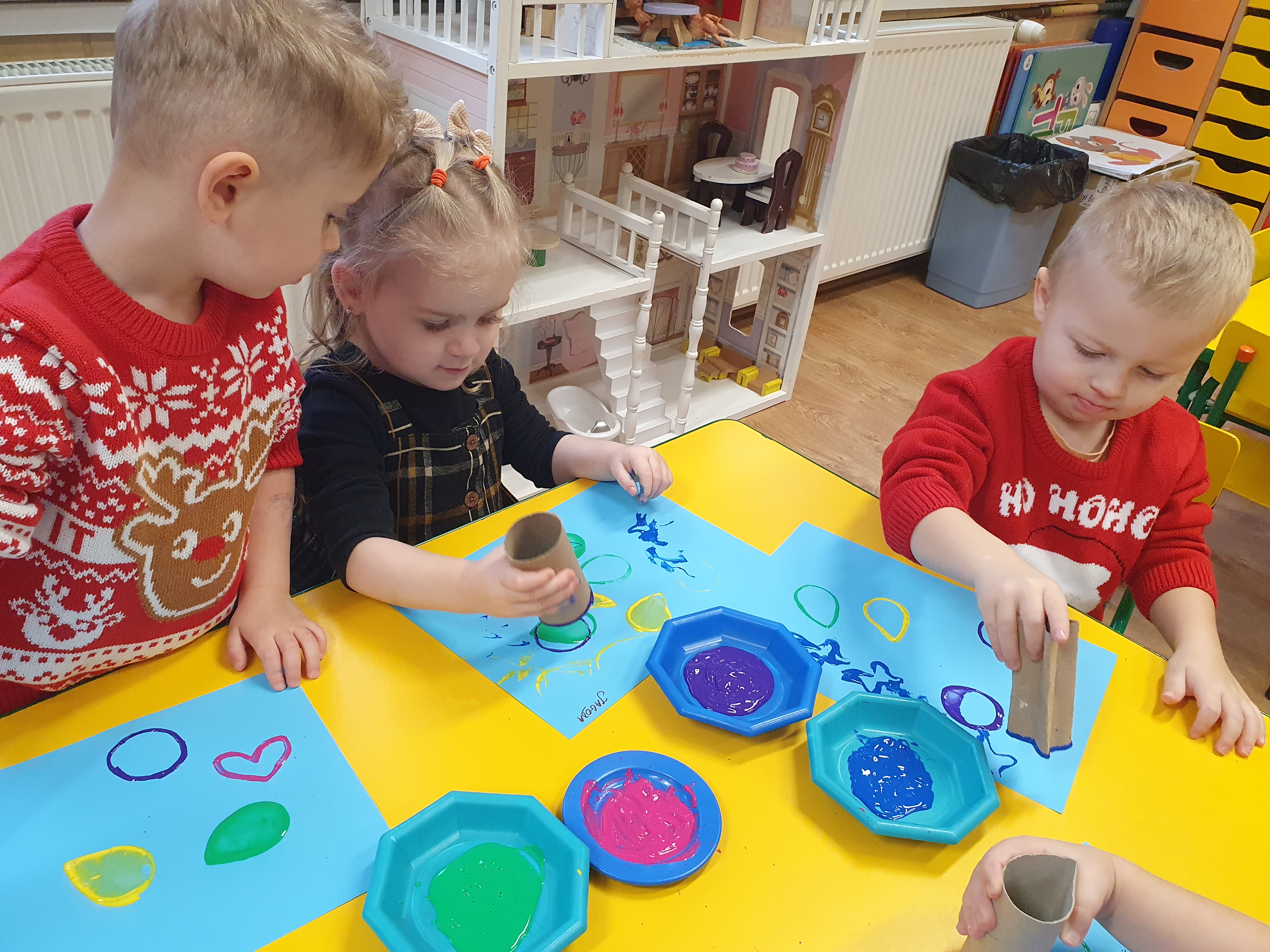 Dzieci z entuzjazmem eksperymentowały z farb a i odbijały stemple na kartkach papieru. Każda praca była wyjątkowa. Przedszkolaki ćwiczyły sprawność rąk i koordynację ruchową.