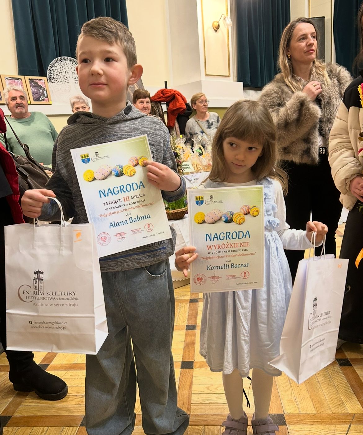 W tym dniu odbyło się również uroczyste wręczenie nagród w VI Gminnym Konkursie Konkursie na „Najpiękniejszą Pisankę Wielkanocną”. Dzieci wykazały się ogromną pomysłowością i talentem – wszystkie prace były wyjątkowe i zasługiwały na uznanie. Gratulujemy laureatom – Alan Bałon III miejsce oraz Kornelia Boczar – Wyróżnienie. Dziękujemy wszystkim uczestnikom za udział w konkursie.