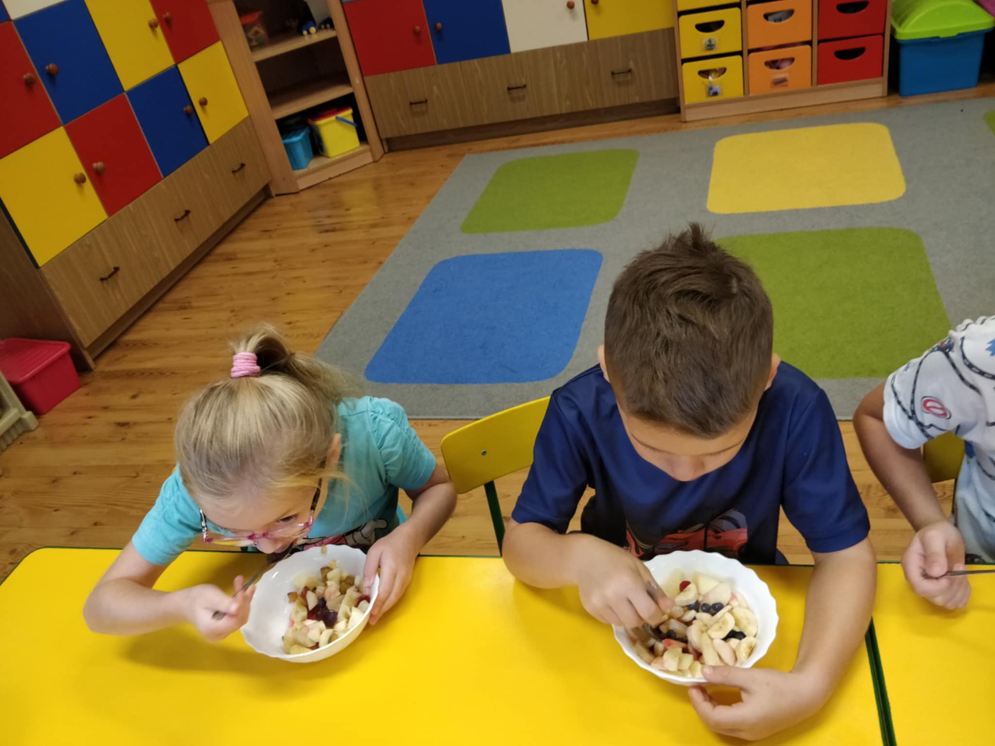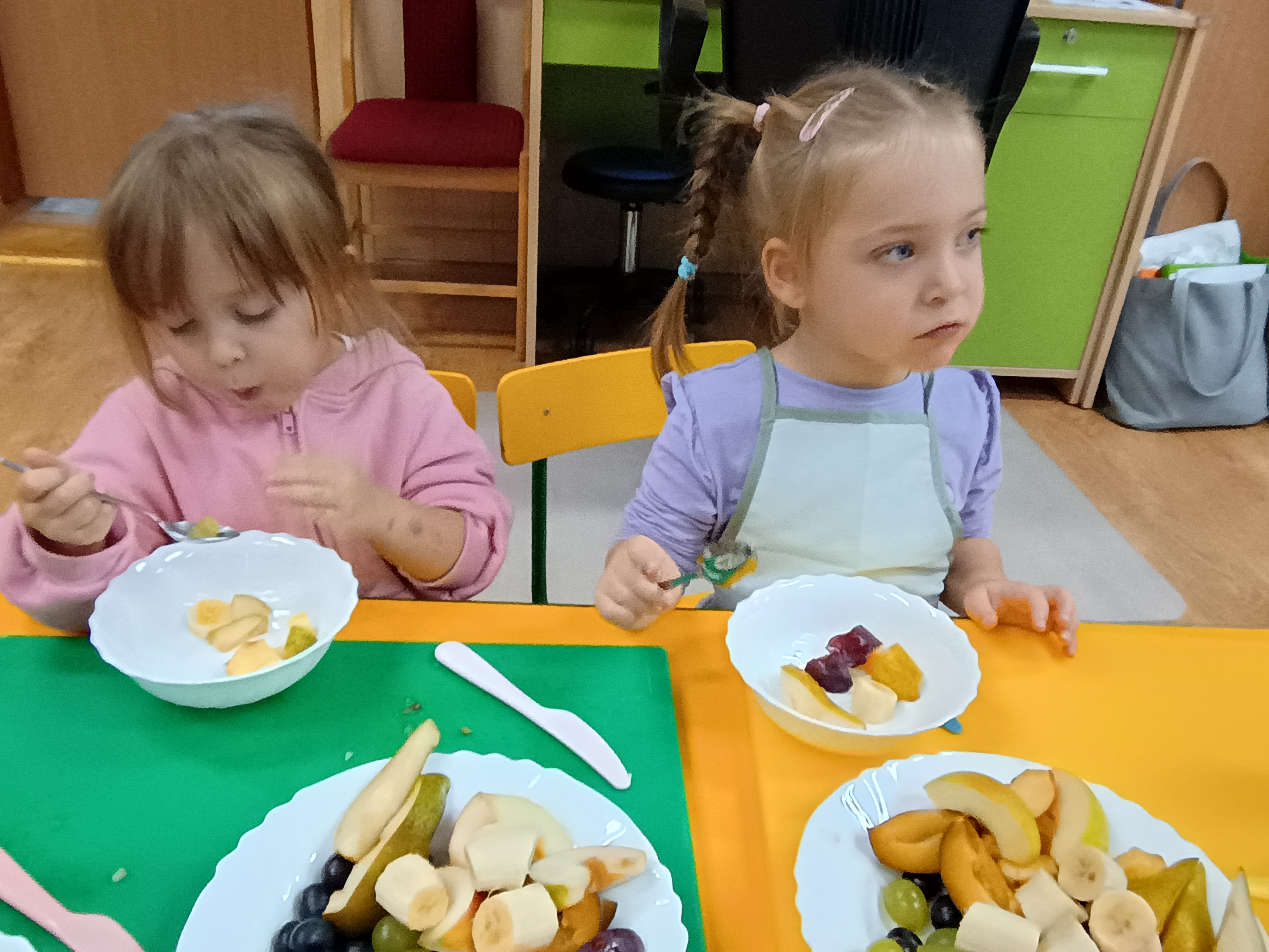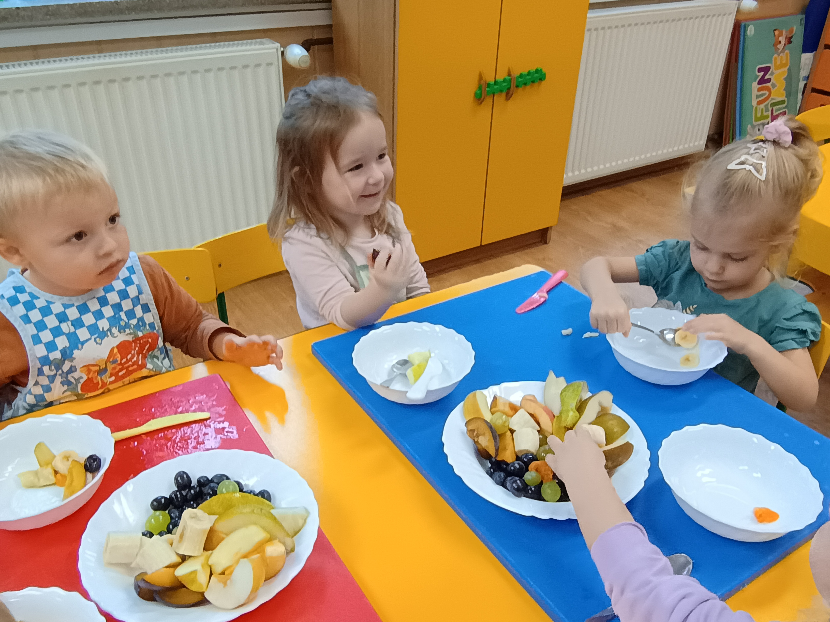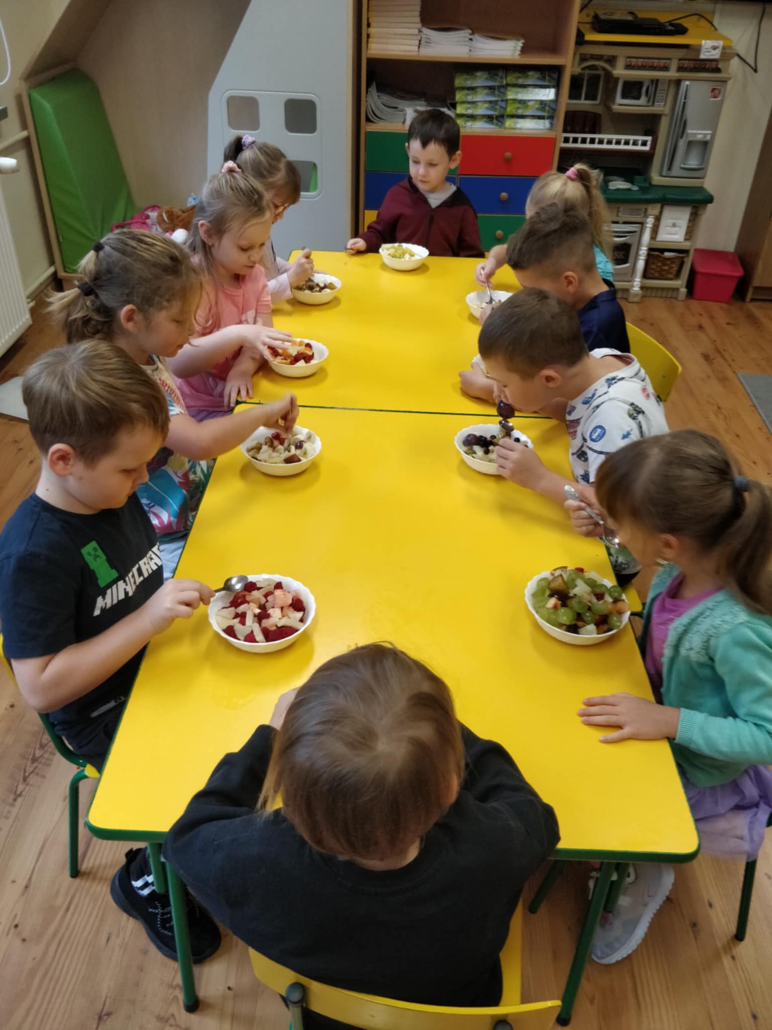 i poznawały ich zapachy oraz smaki. W salach unosił się wspaniały, owocowy aromat, a własnoręcznie przygotowana sałatka smakowała wszystkim wyjątkowo! To był pyszny i zdrowy dzień pełen radości i kolorów! 🍊🍇🍏