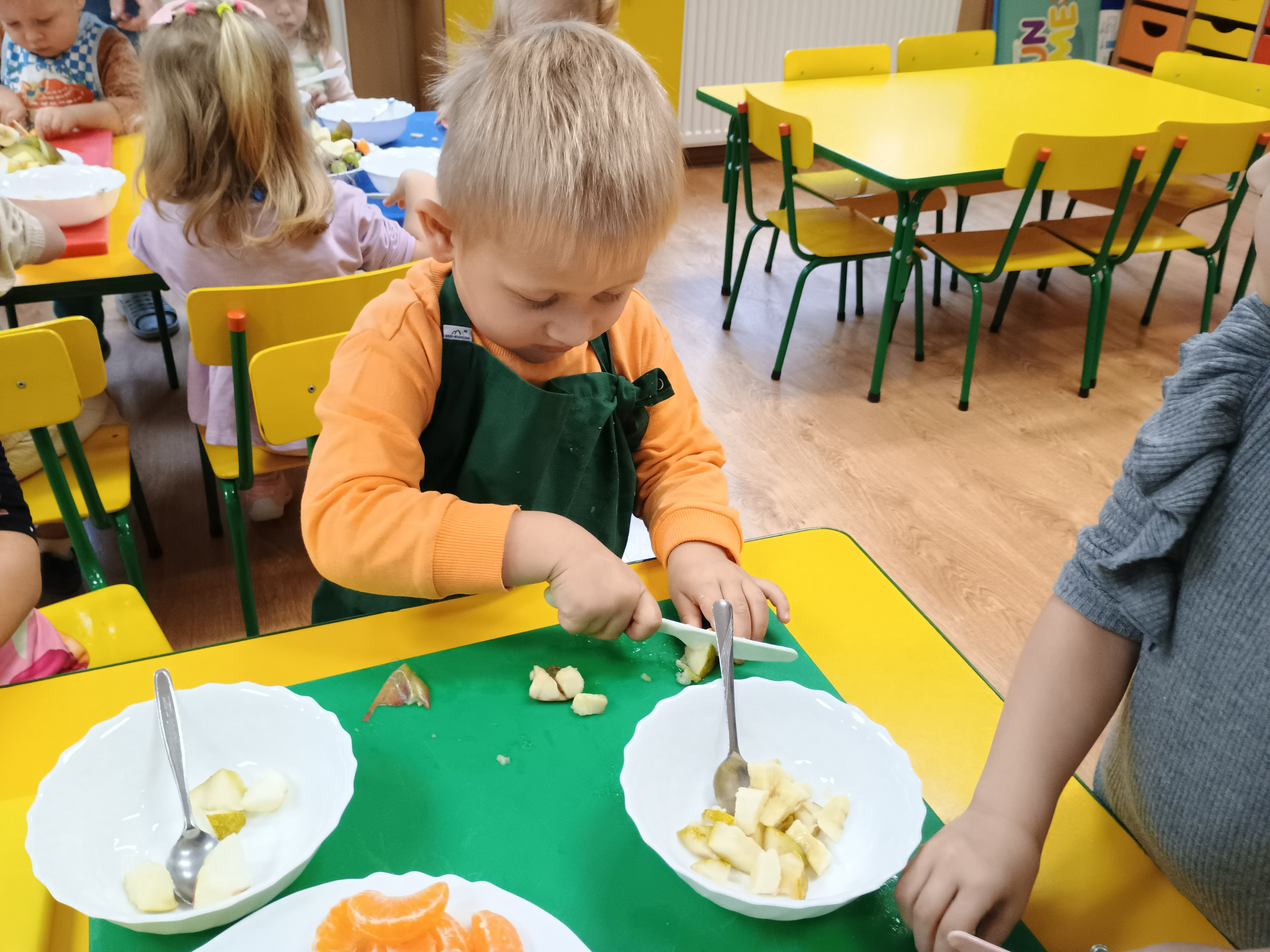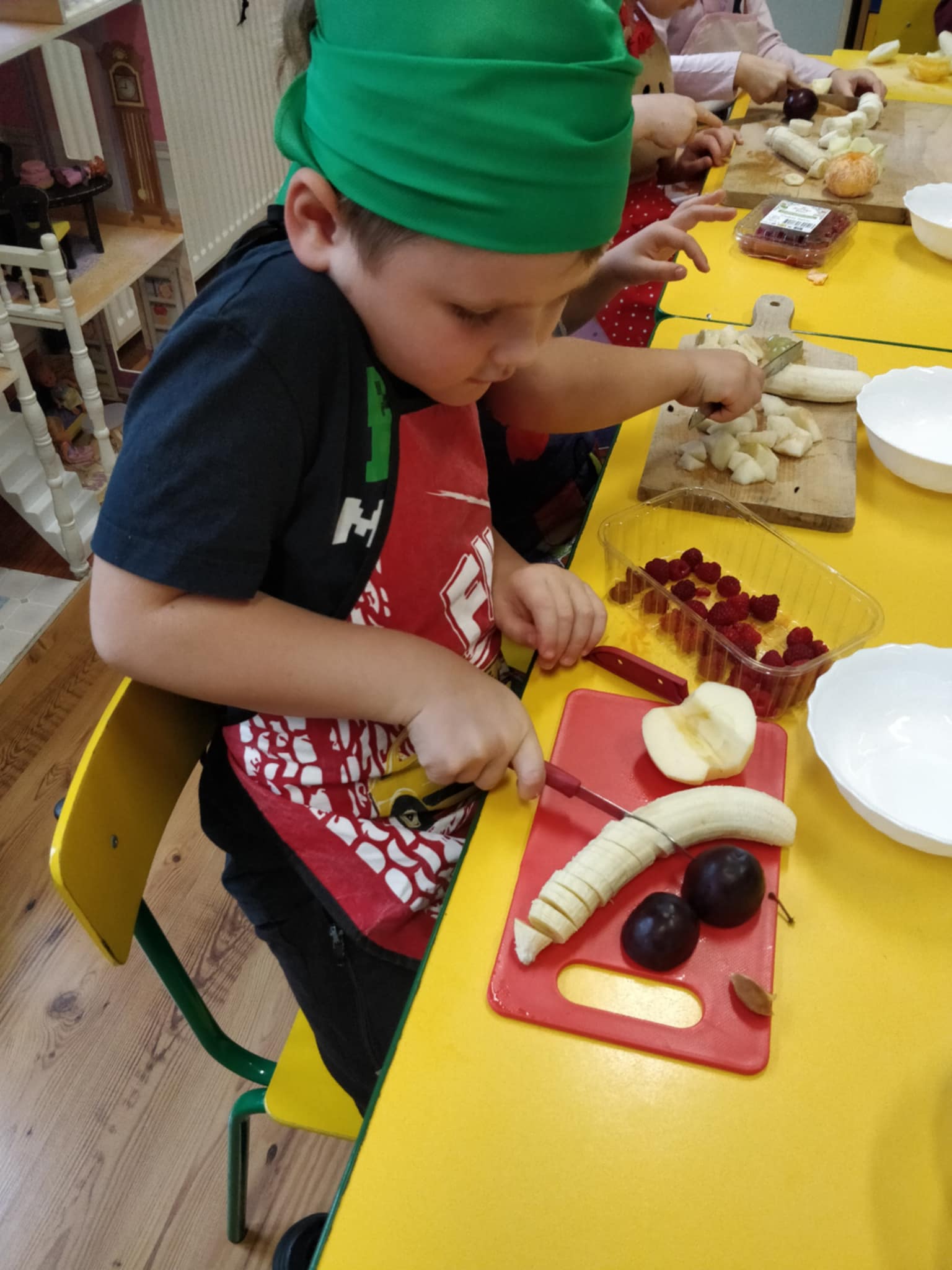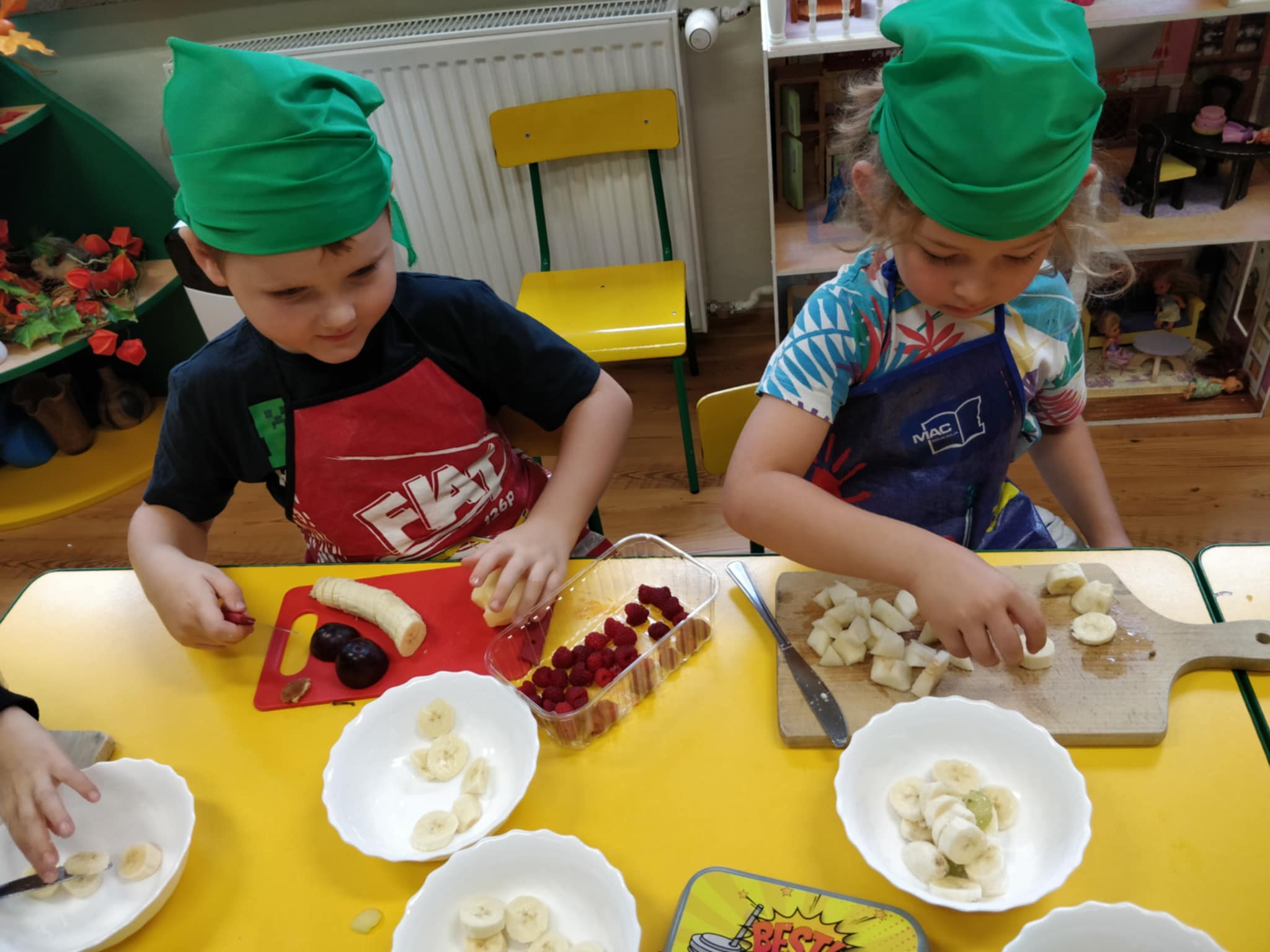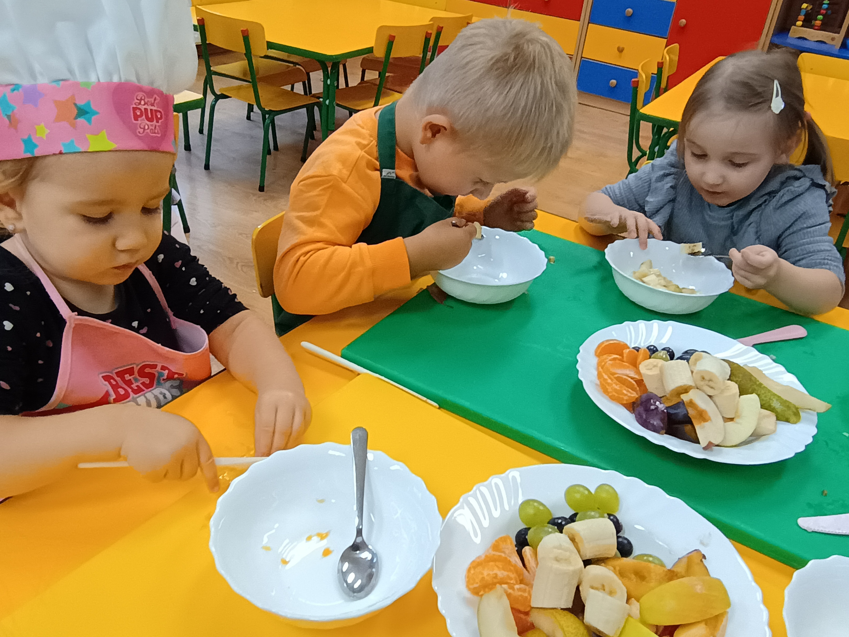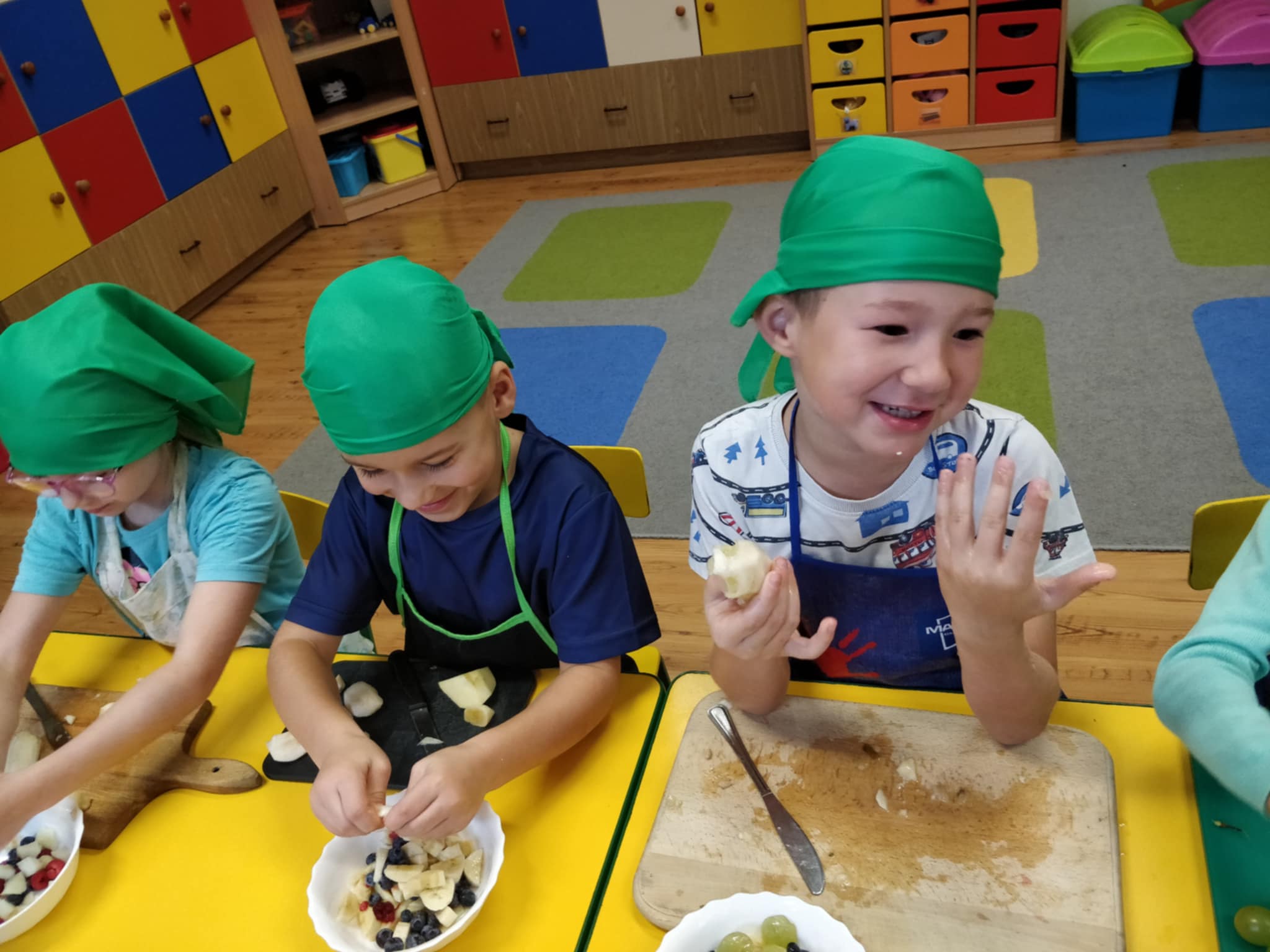 W ramach Aktywnego czwartku nasze przedszkolaki zamieniły się w małych kucharzy i wspólnie przygotowały sałatkę owocową! Dzieci z zaangażowaniem kroiły owoce, mieszały składniki
