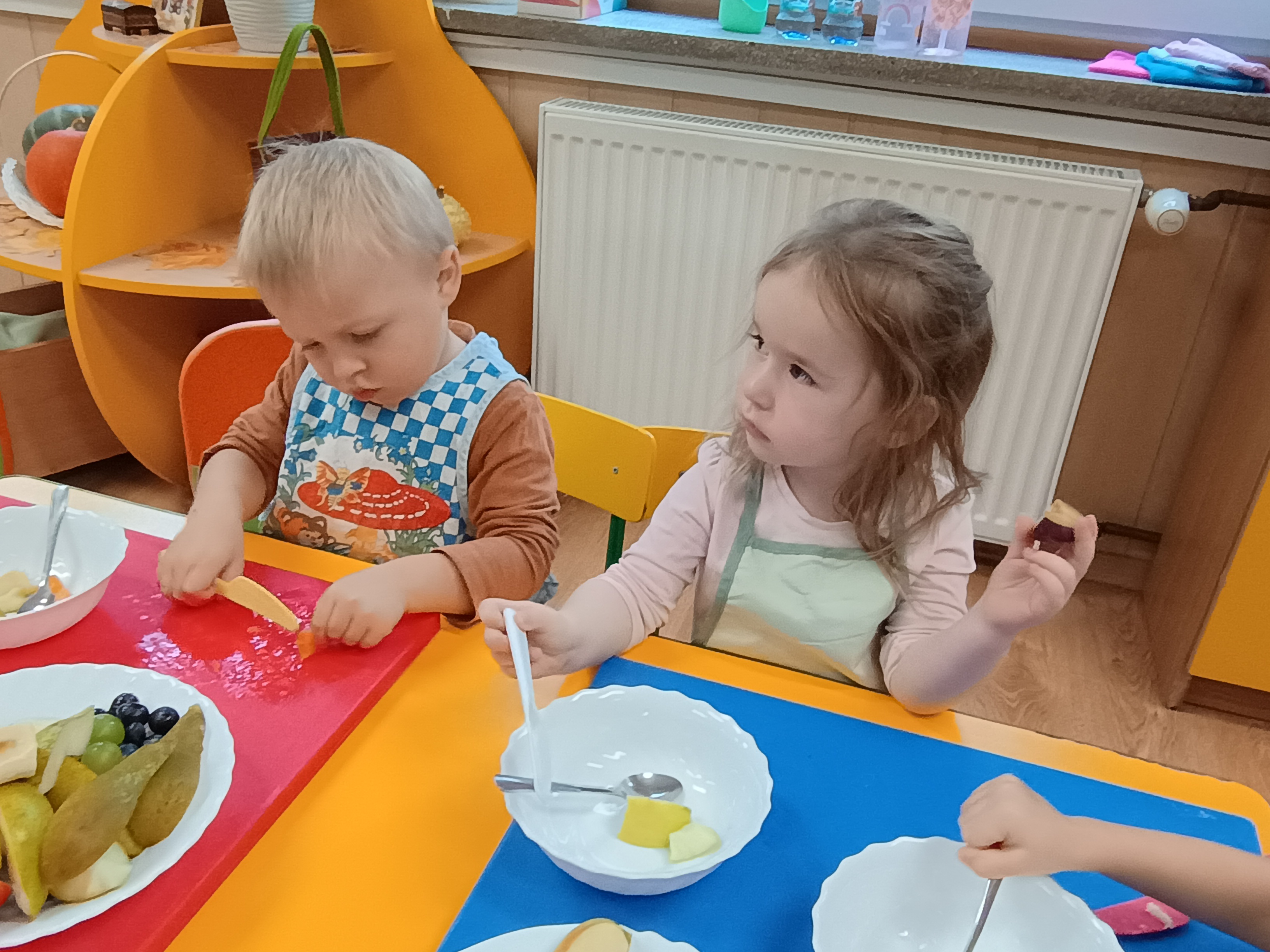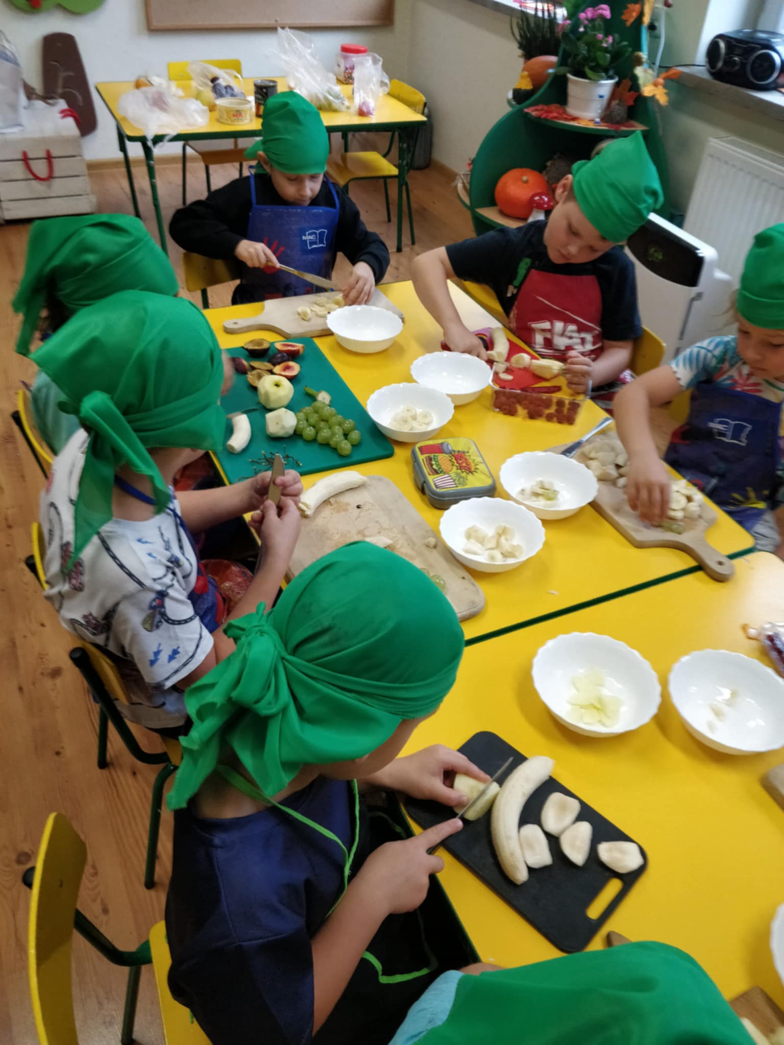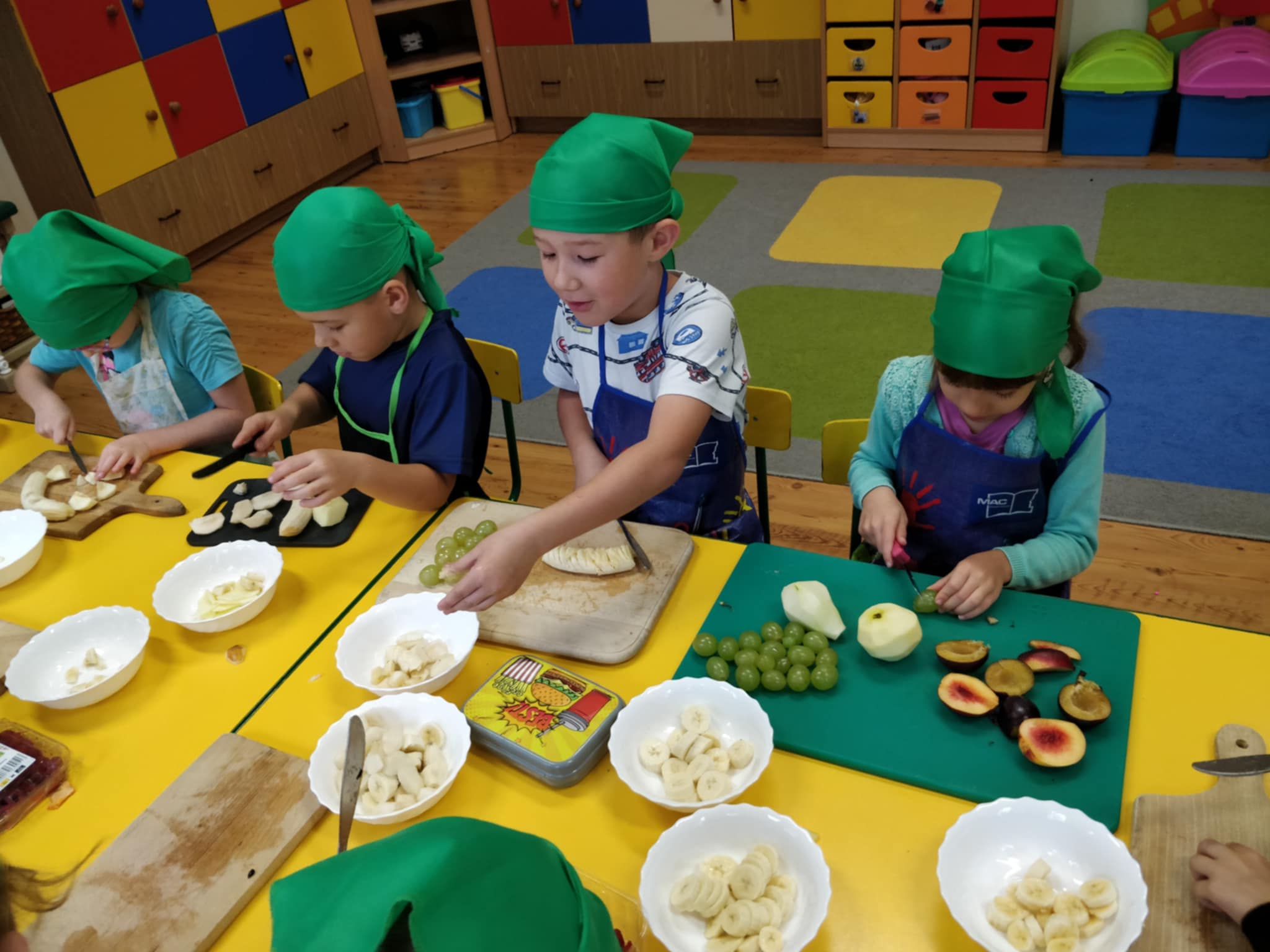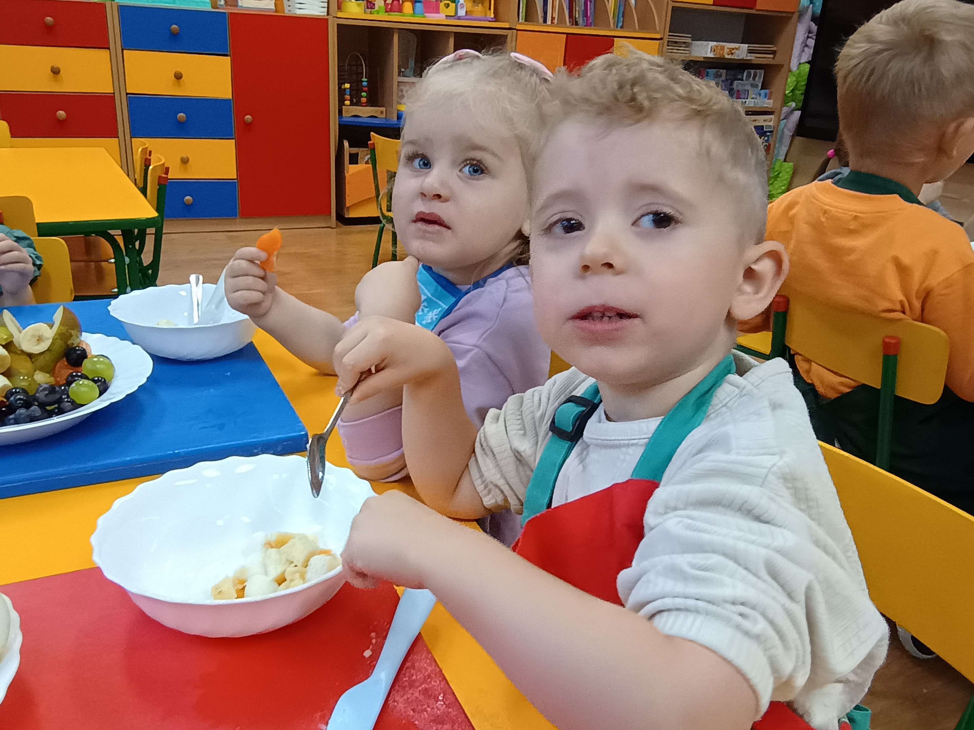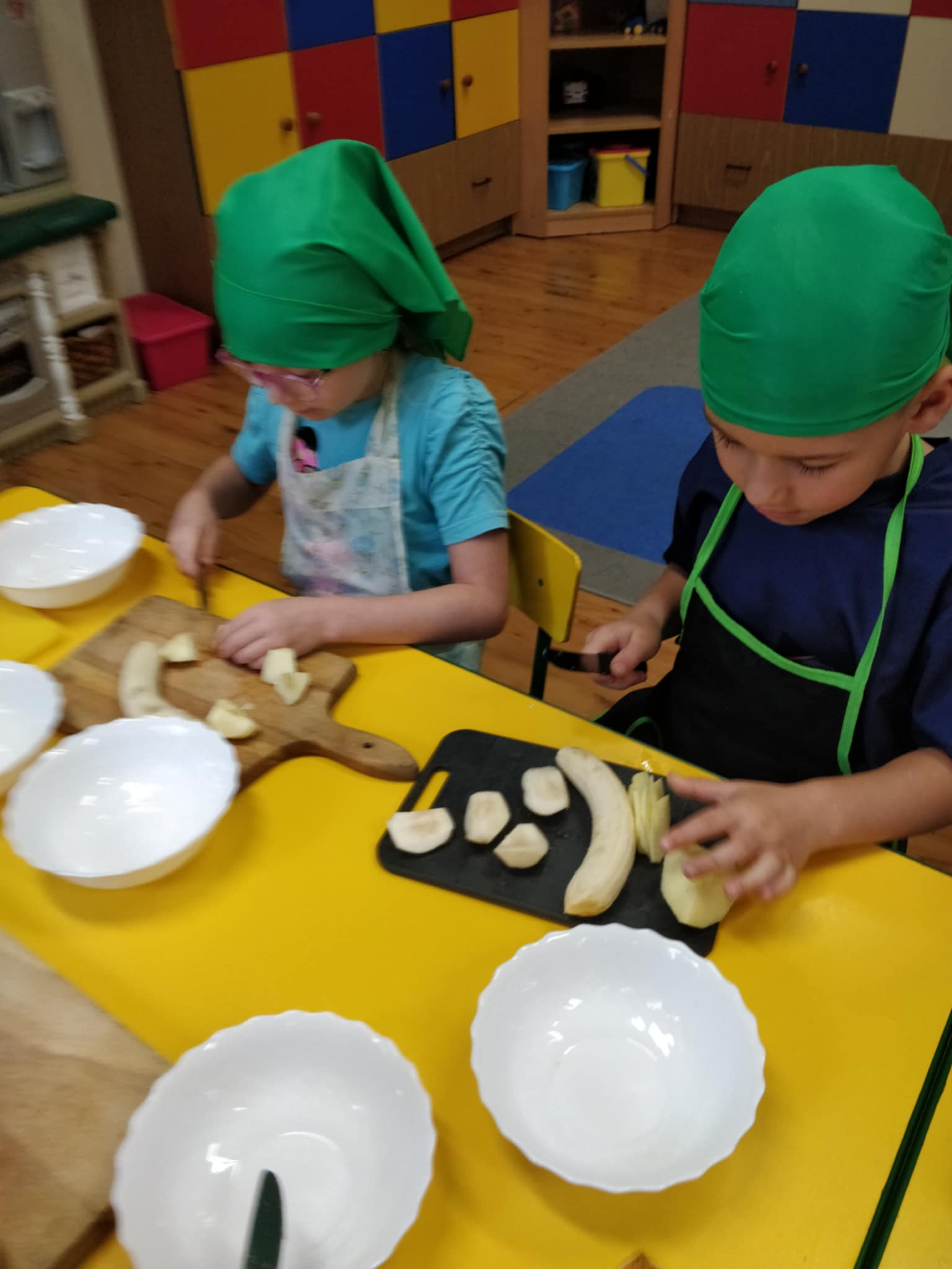 W ramach Aktywnego czwartku nasze przedszkolaki zamieniły się w małych kucharzy i wspólnie przygotowały sałatkę owocową! Dzieci z zaangażowaniem kroiły owoce, mieszały składniki