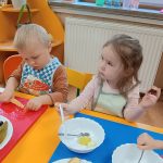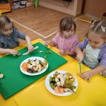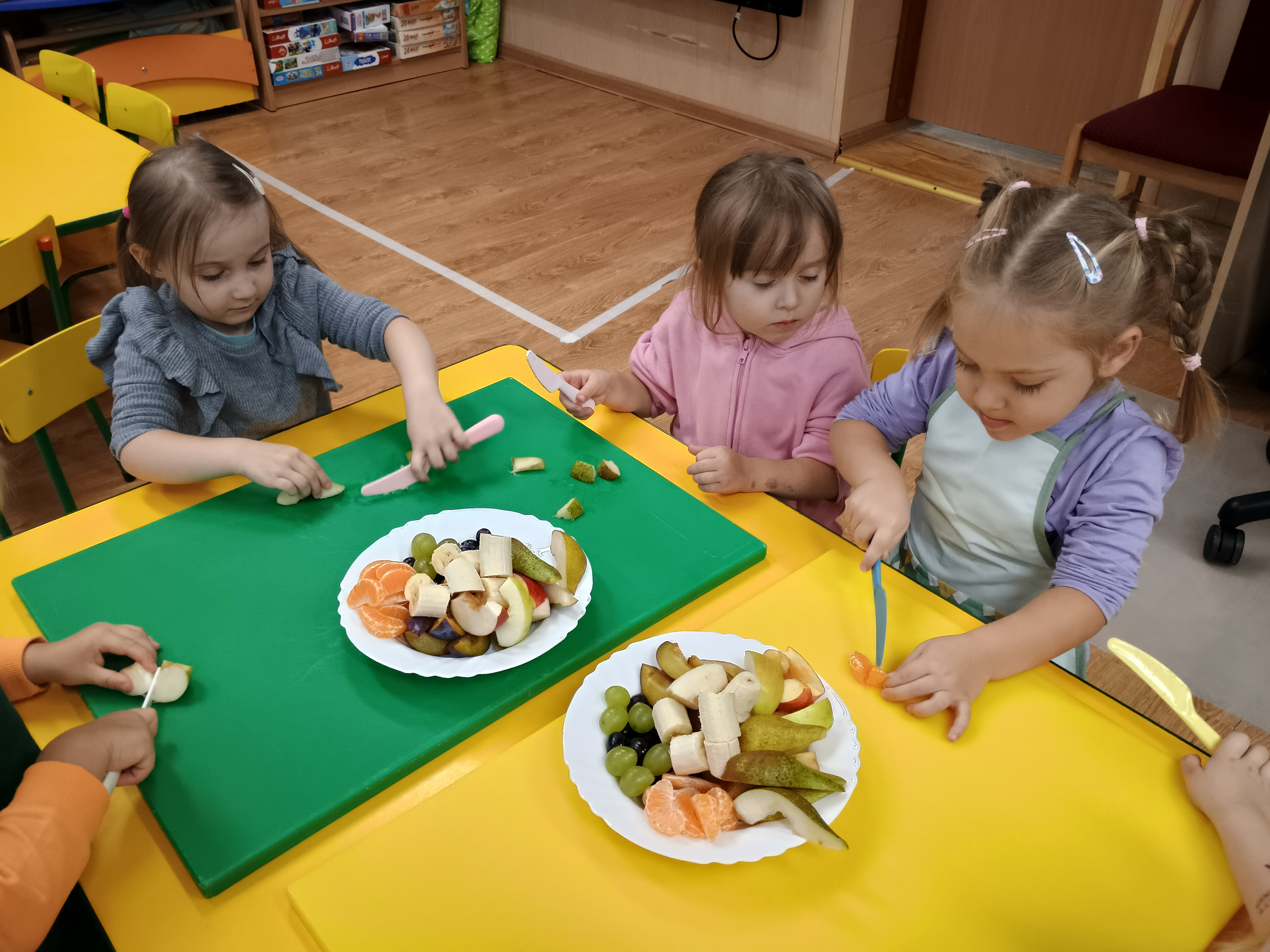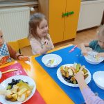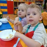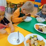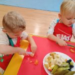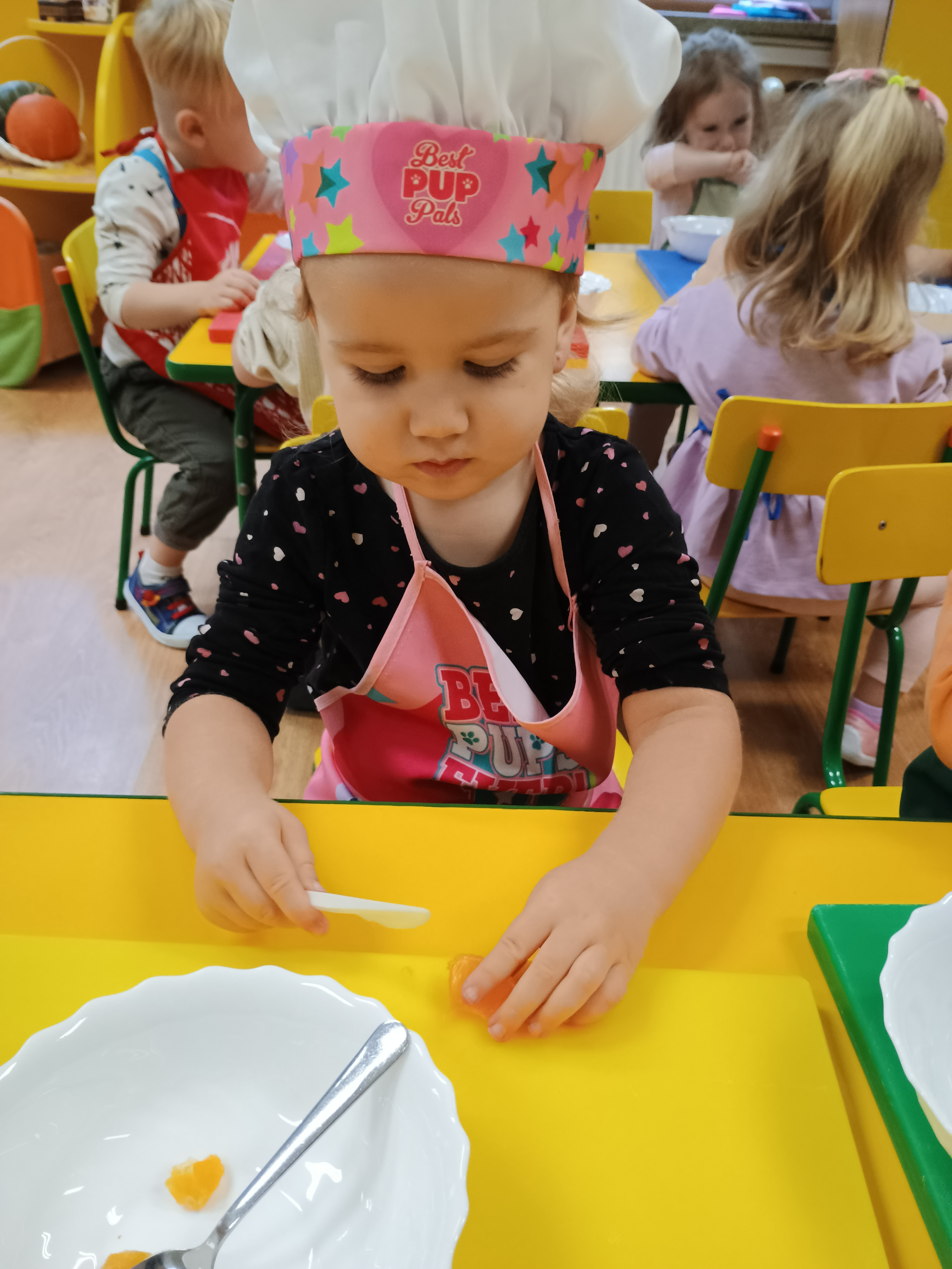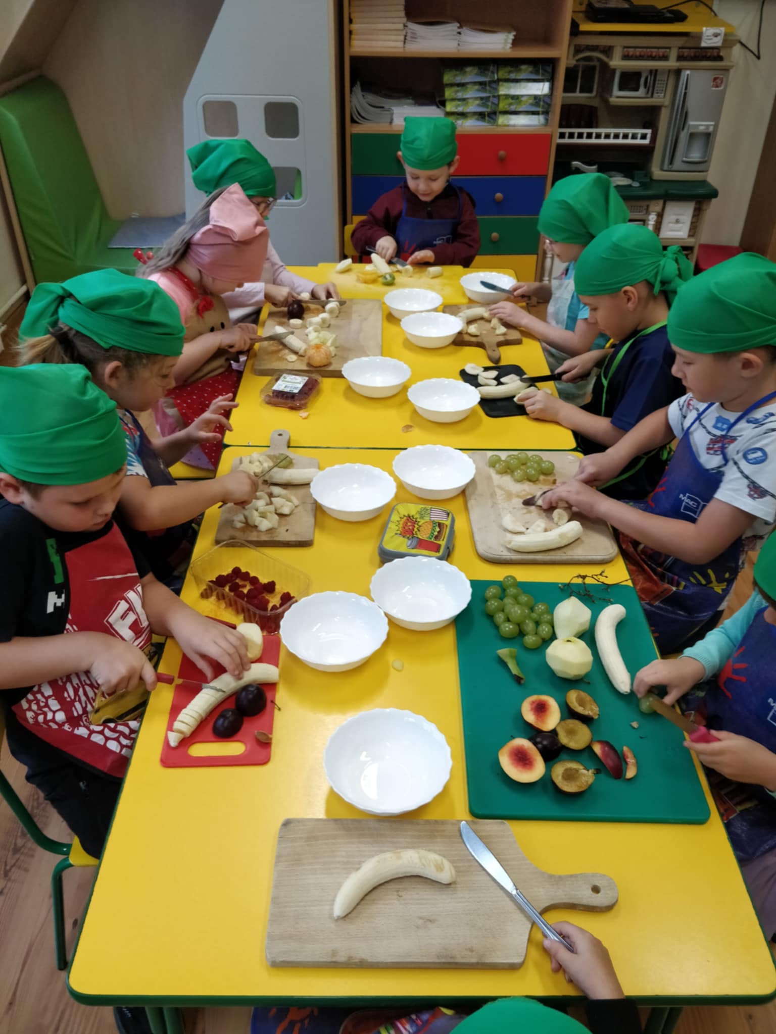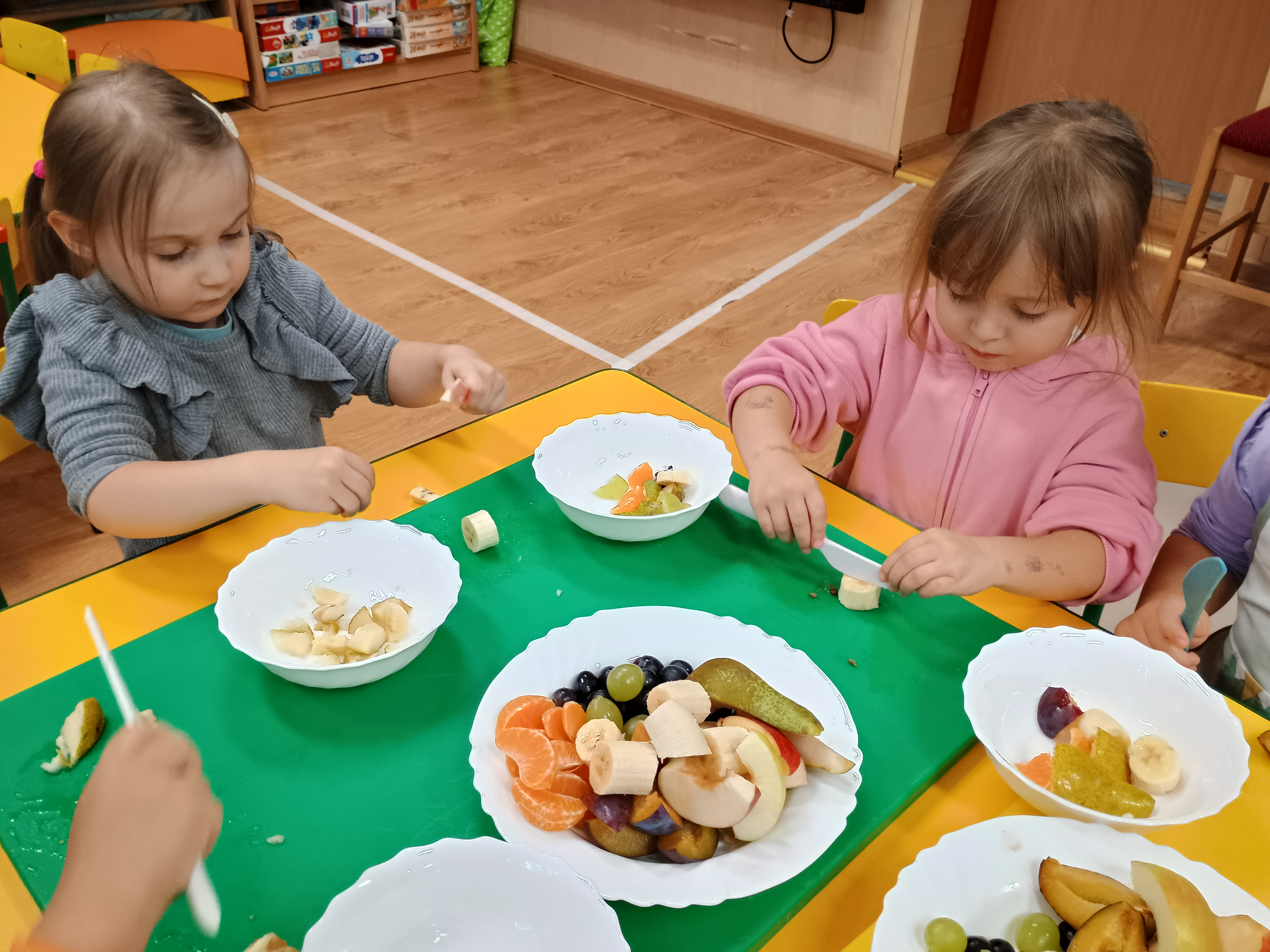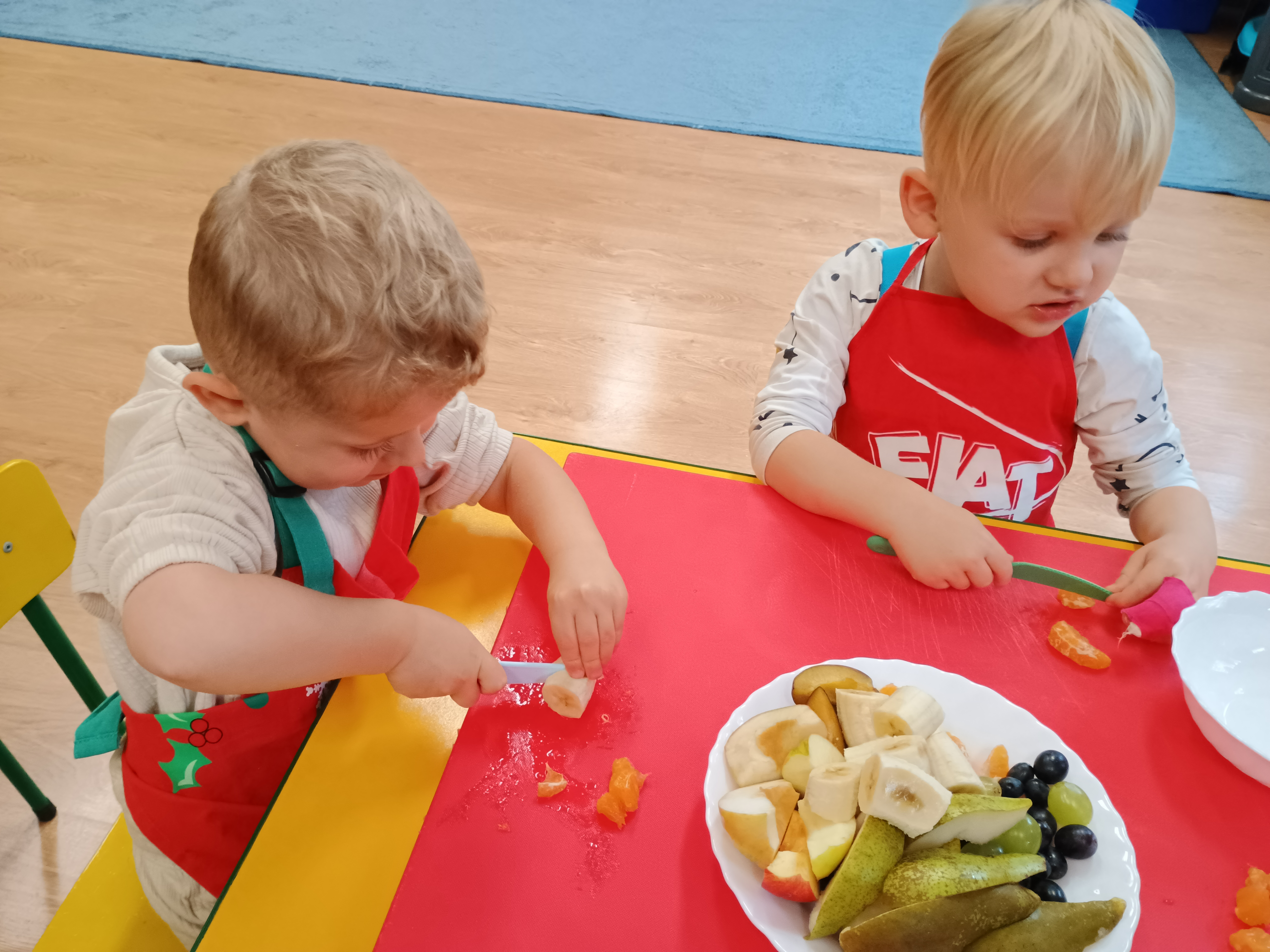 W ramach Aktywnego czwartku nasze przedszkolaki zamieniły się w małych kucharzy i wspólnie przygotowały sałatkę owocową! Dzieci z zaangażowaniem kroiły owoce, mieszały składniki