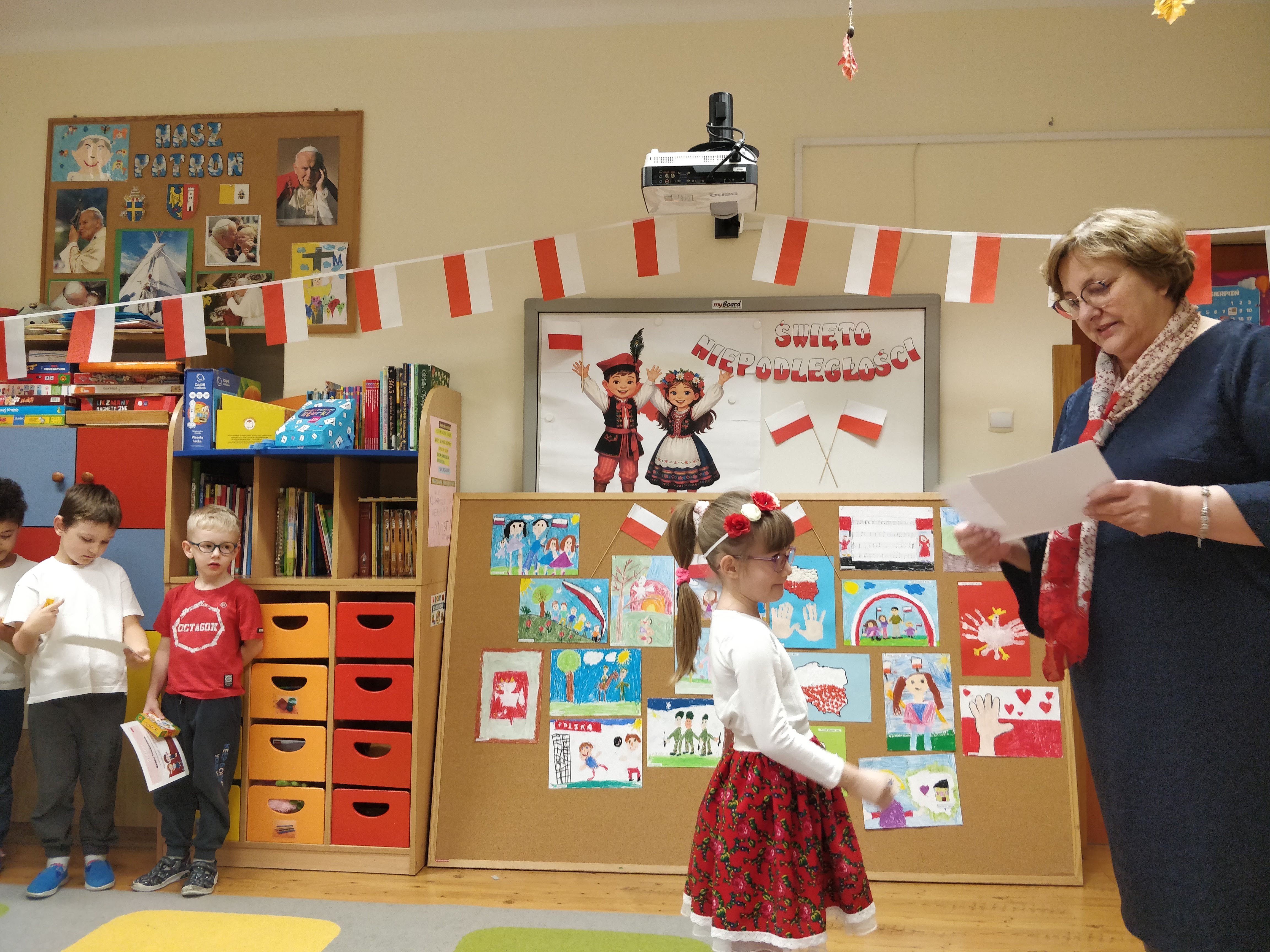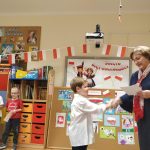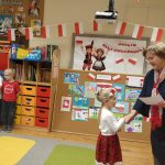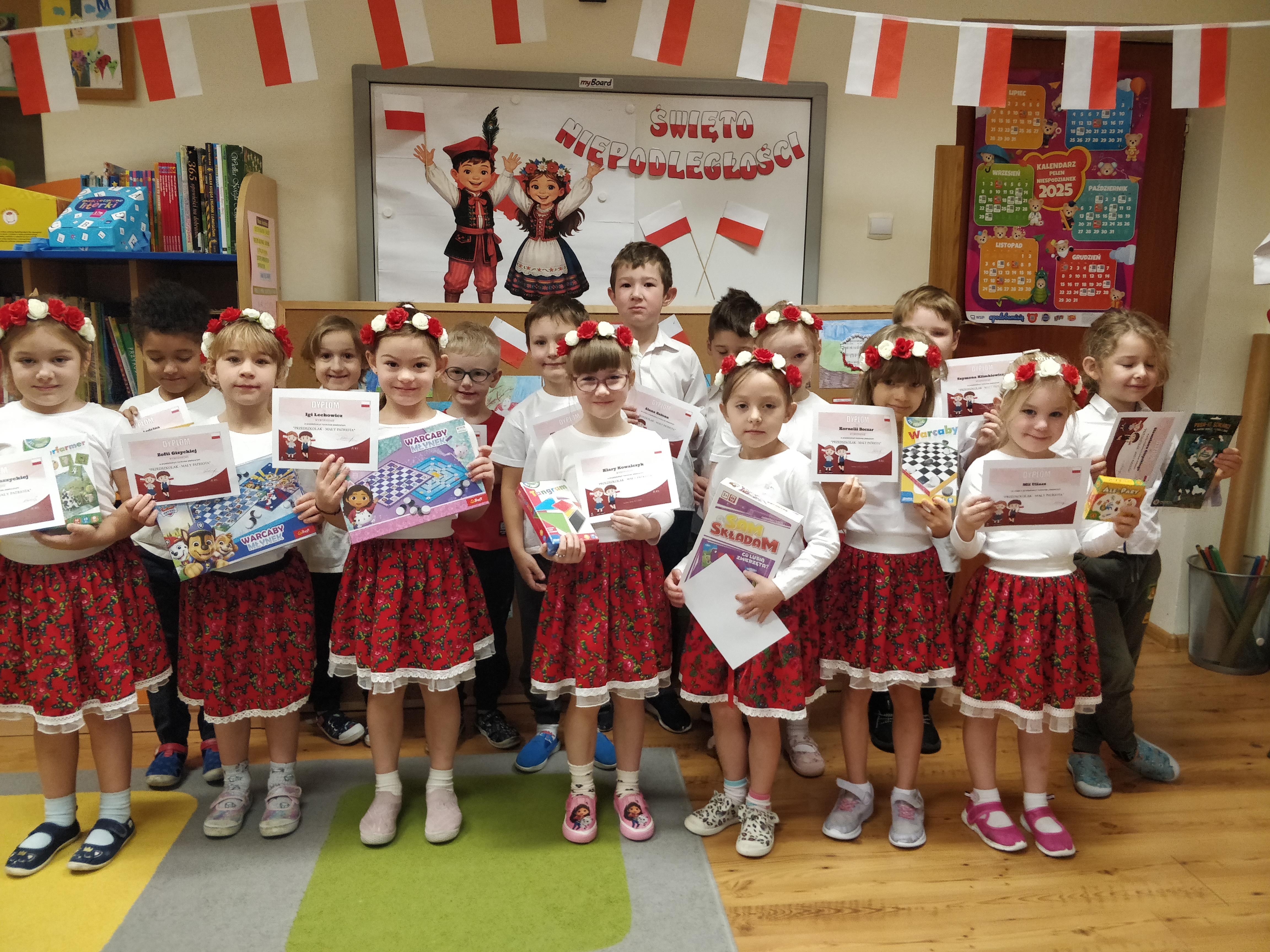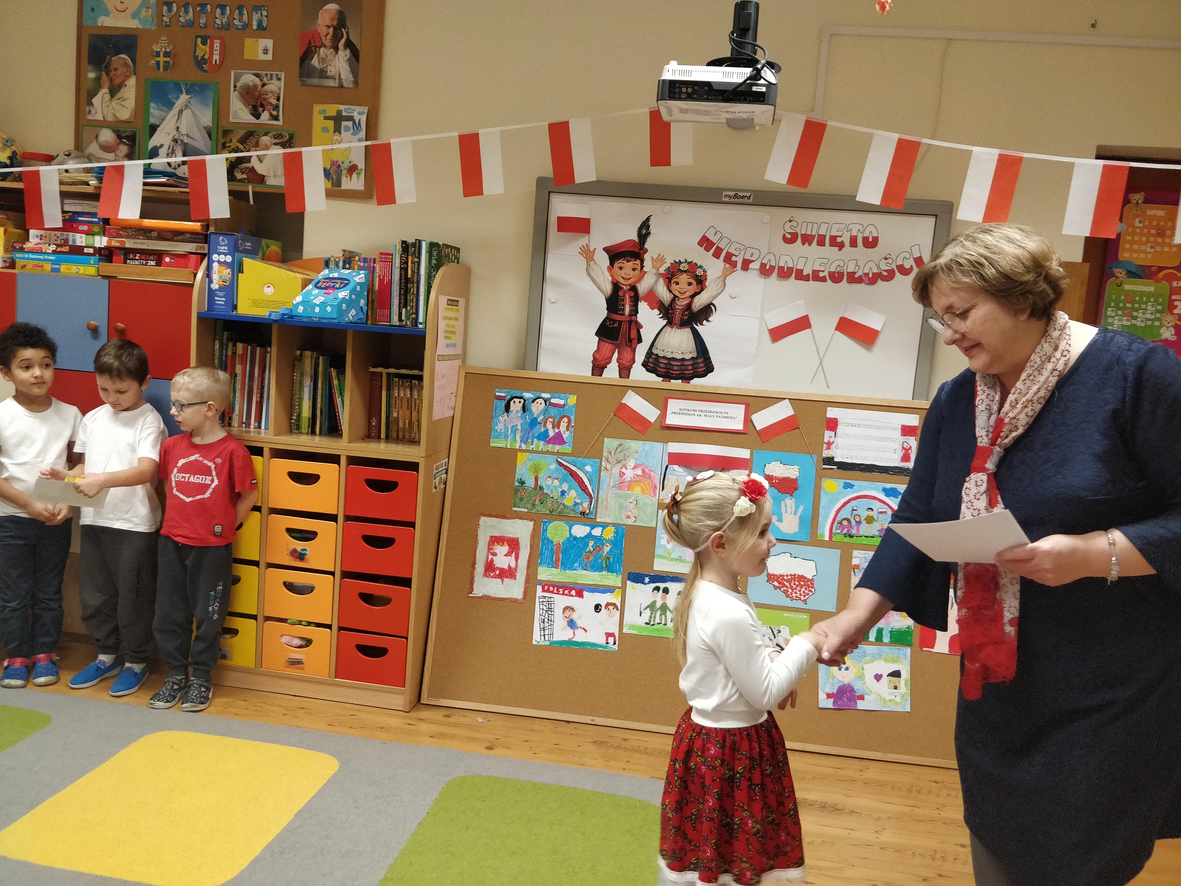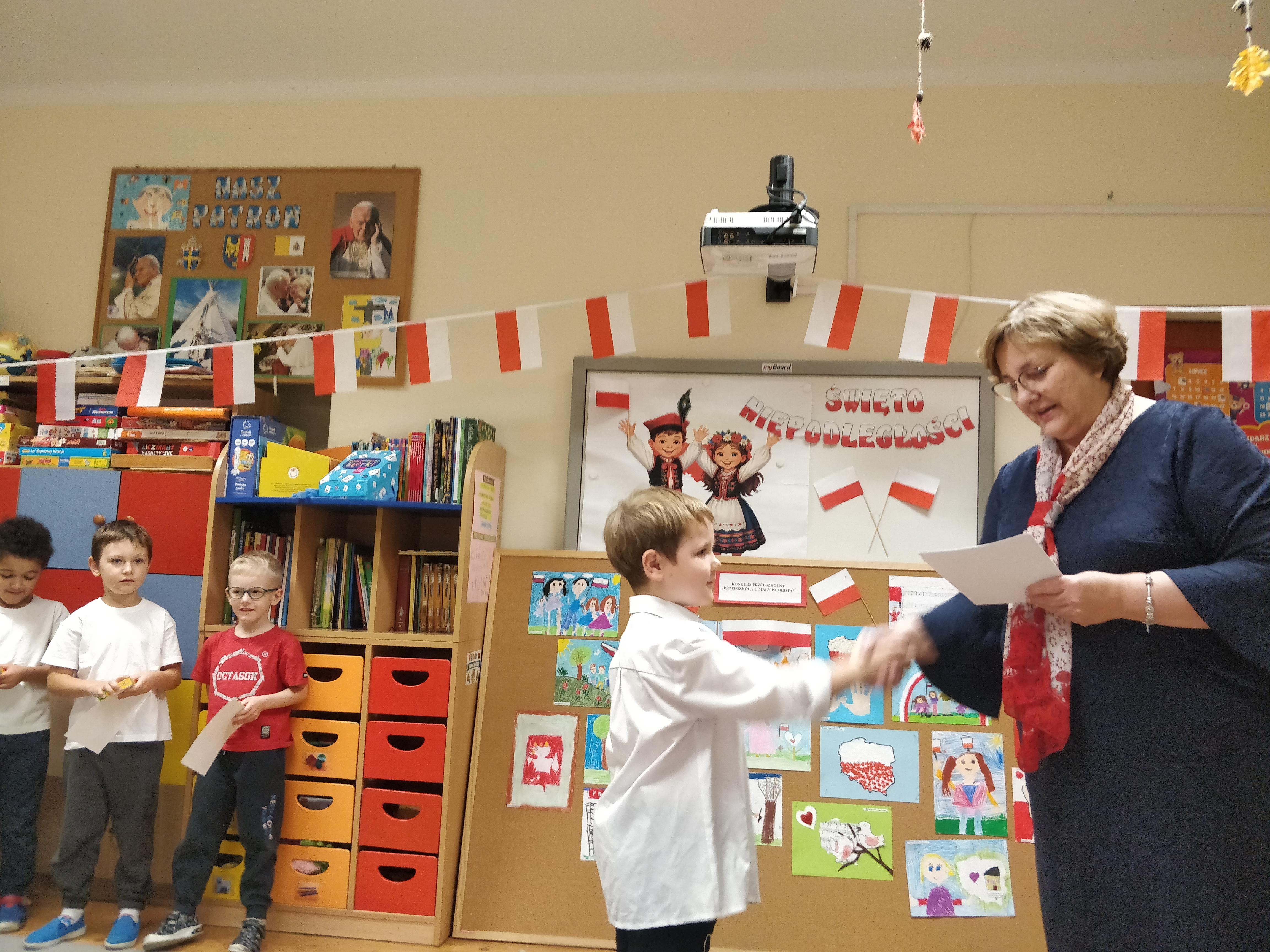 ” Przedszkolak Mały Patriota” . Dzieci przygotowały piękne, pełne symboli narodowych prace, które zachwyciły kreatywnością i starannością. Laureaci z rąk Pani Dyrektor – Krystyny Włodarczyk otrzymali dyplomy i upominki. Wszystkim uczestnikom serdecznie gratulujemy !